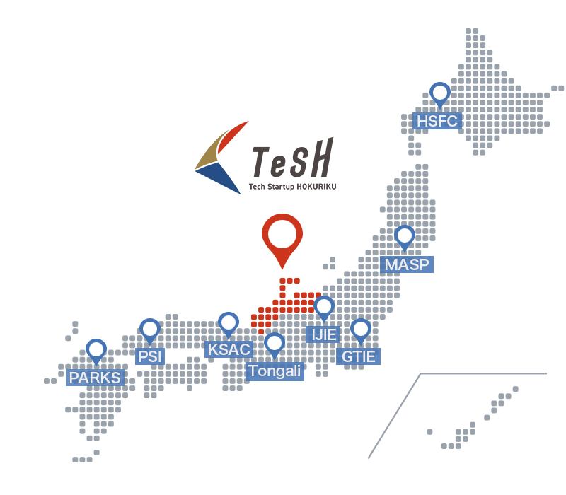 Tech Startup HOKURIKU(TeSH:テッシュ)は、北陸先端科学技術大学院大学と金沢大学を主幹機関とし、北陸3県の11大学、3高専を共同機関とする北陸地域の大学・高専発スタートアップ創出プラットフォームです。