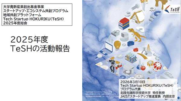 Tech Startup HOKURIKU(TeSH:テッシュ)は、北陸先端科学技術大学院大学と金沢大学を主幹機関とし、北陸3県の11大学、3高専を共同機関とする北陸地域の大学・高専発スタートアップ創出プラットフォームです。