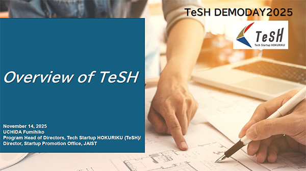 TeSH's innovative initiatives, such as the careful support of participating universities and technical colleges organized into three groups, have received high praise. Additionally, Professor Miyako of JAIST, representing TeSH, won the Grand Prize in the Step 2 pitch contest among nine startup support platforms nationwide, which took place in October at BioJAPAN 2025. I also participated in this event. This achievement demonstrates the high quality of research seeds in the Hokuriku region, and we look forward to its continuous expansion.